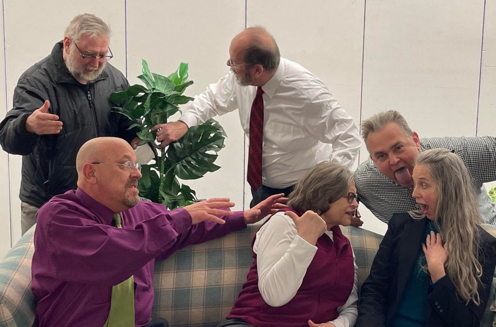 The Green Room Groupies engaging in their usual calm, cool, and collected discussion of theater theory! Back row (left to right): Bob Yoman, a surprise plant, David Wahr (me), Ron Roberts. On the couch (left to right): Brian Burchette-Ross, Carol Sliwcka, Kathleen McBee.
