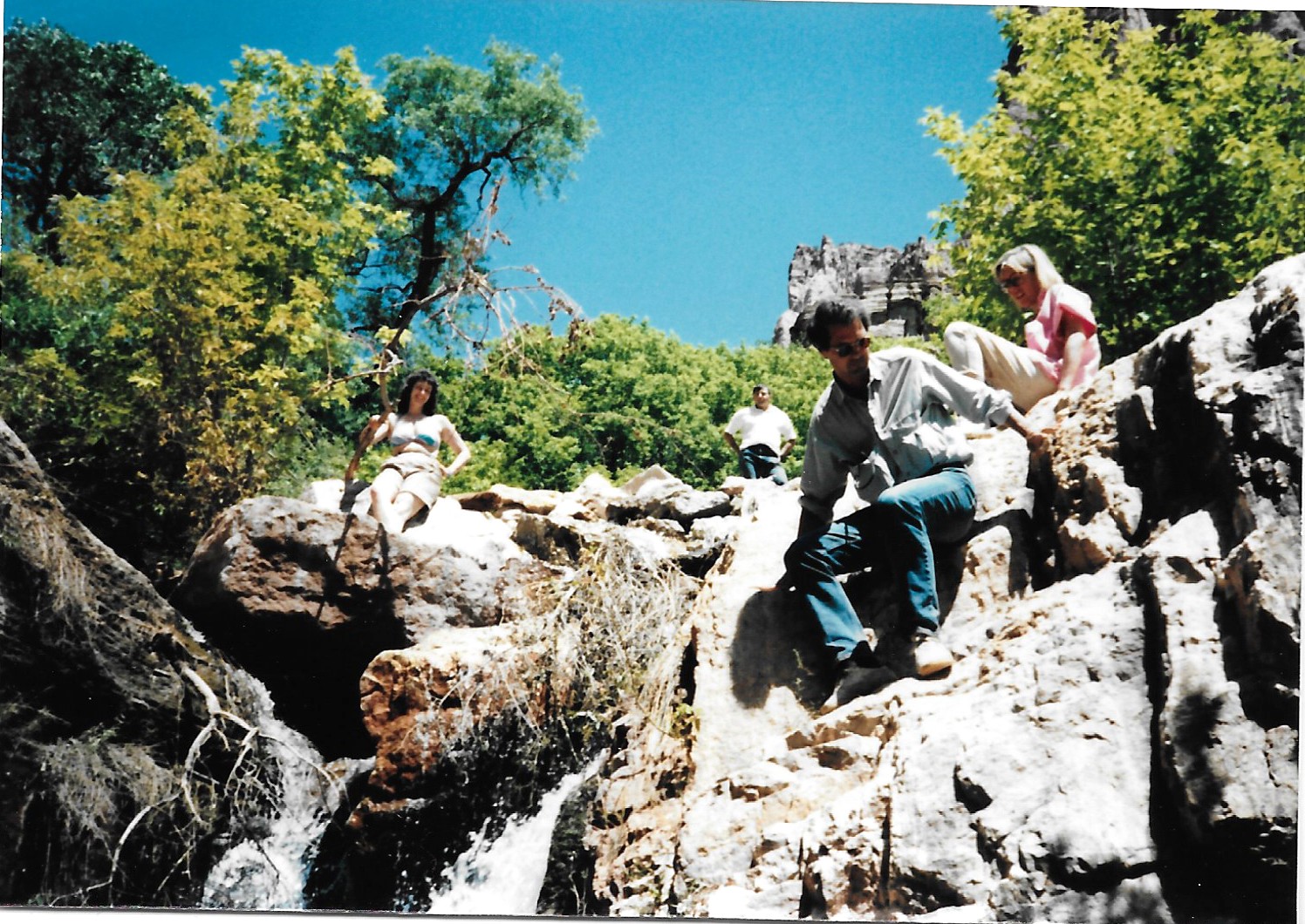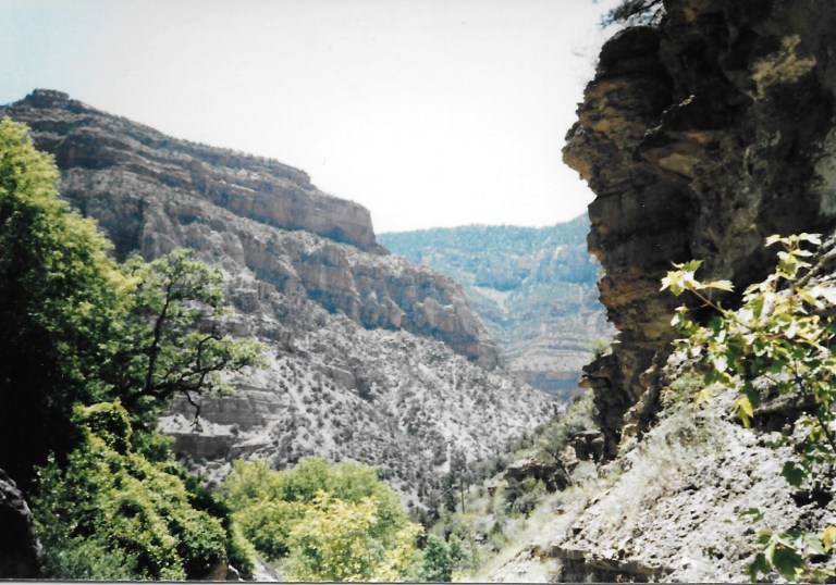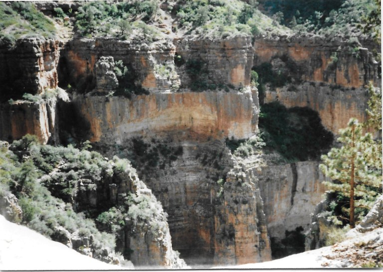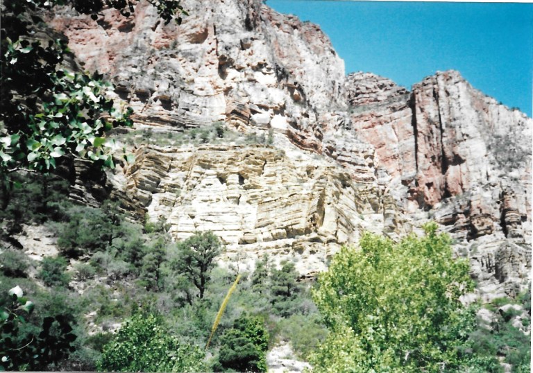 I suspect we stopped at the Roaring Springs Day Use area, but it could have been all the way to the Manzanita Rest Stop. In any case it took about three or four hours to get down to what our guide called “the bottom.” Though she also pointed out that we were several miles still from the river. I don’t recall seeing Roaring Springs though we must have passed them. There was a small creek where we stopped for lunch, which I presume was Bright Angel Creek which is the only stream in the part of the canyon we were in given that there was no run off from snow (it was July after all). Sadly this adventure took place in the age of film. So I had to conserve my pictures. Today, I would have taken pictures of signs, people, our mules, etc. This also explains the poor image quality of the pictures which accompany this post (that and my cheap scanner).